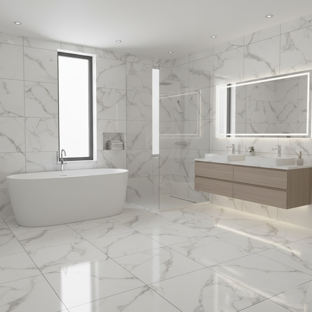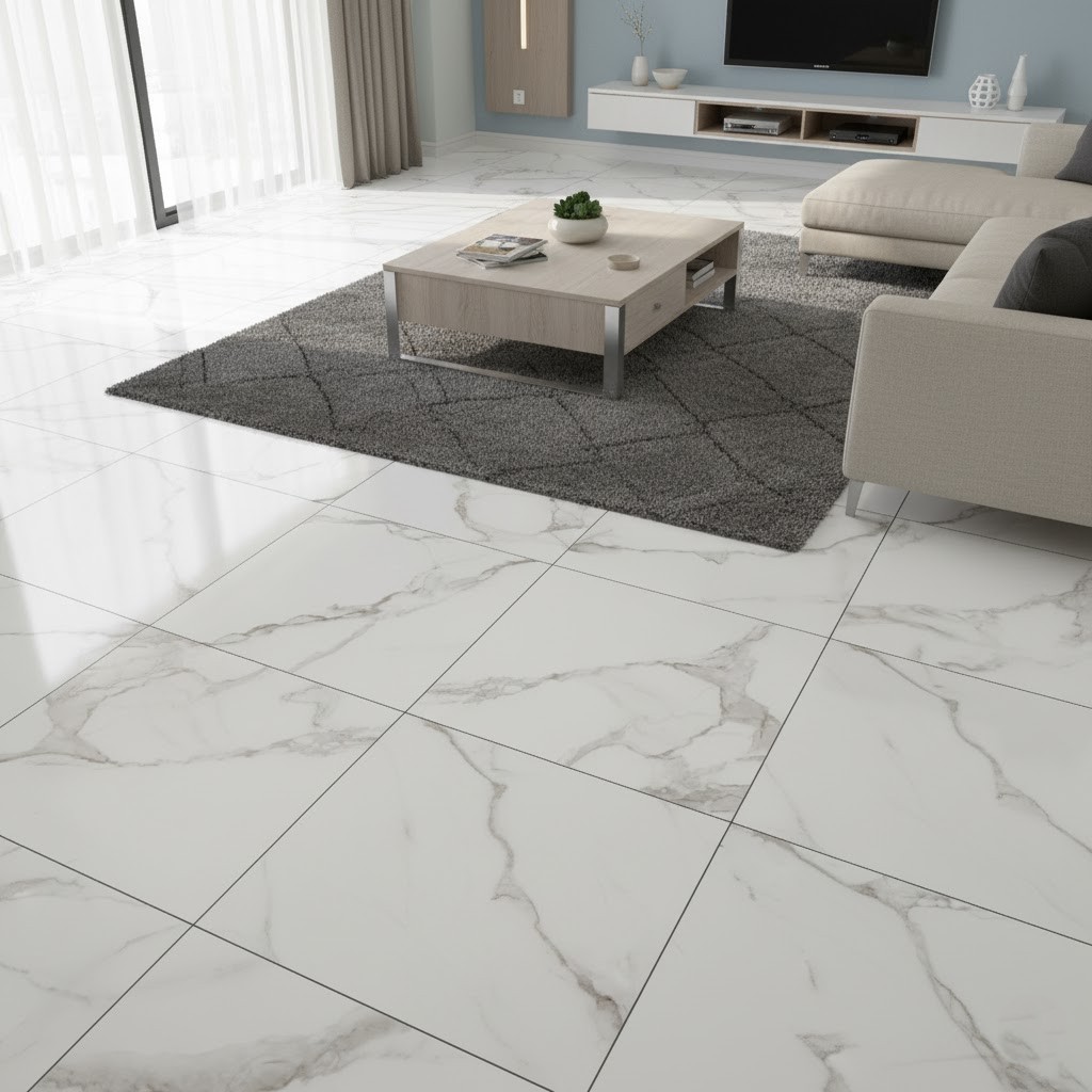 Piso cerámico Calacatta Andino 45×45 presenta un elegante fondo blanco con vetas grises oscuras suaves, acabado brillante y 6 caras variadas que recrean la elegancia del mármol natural. Ideal para pisos y paredes de salas, baños y cocinas, está diseñado para tránsito medio, ofreciendo luminosidad, estilo y fácil mantenimiento en cada ambiente.