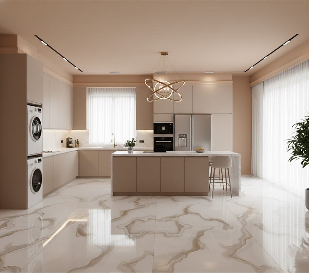 Porcelanato vitrificado con diseño sofisticado con fondo blanco brillante y vetas marrones claros que fluyen con naturalidad, creando un efecto marmoleado con destellos dorados únicos en cada cara variada. Ideal para pisos y paredes para realzar la elegancia de tu sala, baño, cocina o dormitorio, adaptándose a diversos estilos con un acabado de alto impacto visual en interiores residenciales o comerciales de tránsito medio, donde se busca un acabado sofisticado y duradero. Descubre este y más modelos en www.marketceramico.com
